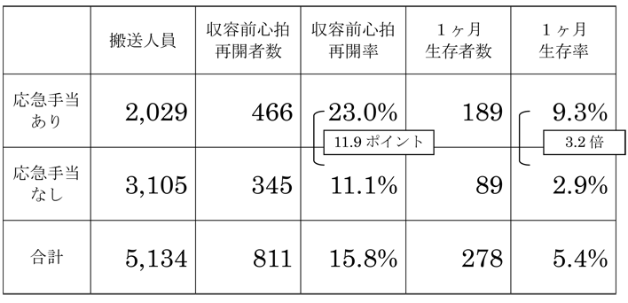 表 病院収容前の心拍再開状況と1ヵ月後の生存状況