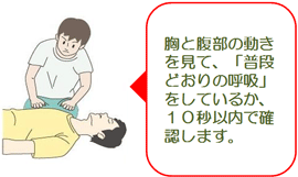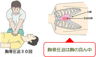 4.普段どおりの呼吸がなかったら、 すぐに胸骨圧迫を30回行う ![]() |