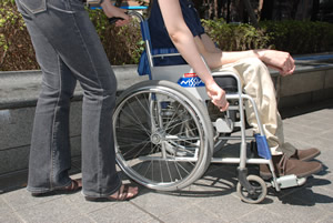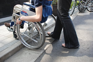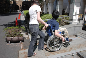| 【介助のポイント】 ・車いすを動かすときや進行方向を変更するときには、事前の声掛けを心掛ける。 ・介助者が、車いすを動かす前に「今から動きます」「前に進みます」などの声をかけることにより、車いすに乗っている人は、これから何が行われるのか予測がつき、安心することができる。車いすを止めるとき、バックするとき、曲がるときにも、事前に声をかけを行う。 ・車いすを押しているときに前輪が段差に引っかかると、勢いで利用者が前に落ちてしまうことがある。段差があるときは一時停止をしてから越えてるようにする。(写真.1)逆に、傾斜が急なスロープなどでは、車いすが後ろに転倒してしまうことがあるので、状況にあわせてバランスに注意する。 ・停止するときや、介助者が少しでも車いすから離れる場合は、サイドブレーキをかける。(写真.2) ・車いすでの移動は、階段、段差だけでなく、人混み、狭い通路、急なスロープ、通路の傾斜等の通過にも困難をともなう。狭い通路やドアを通過するときは、車いすの左右に注意する。標準的な車いすであれば、おおよそ80cmの幅があれば通過することができる。急なスロープを下るときは、後ろ向きに下りるようにする(写真.3)。いずれも、事前に本人へ確認をする。 車いすに乗っている人の中には、言語の障害をともなっている人もおり、コミュニケーションが難しいことがある。わからないことは、文字で書いたり丁寧に聞き返したりして確認する。 |