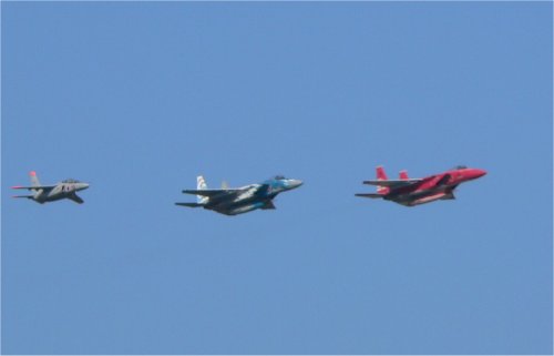 オープニング飛行より。 303,306SQの一番機? +T−4 ちょっとピンボケな上に、縮小したので かなり見辛いのぅ〜 スマン(T_T) |