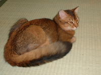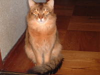 ソマリの特徴であるキツネのようなふんわりしたしっぽが空中、真横にピーンと立っている。