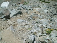 足はガクガク・・・ やっと下まで降りてきたよ!! 遠〜〜くの山のてっぺんに雄山の頂上が見えま〜す。