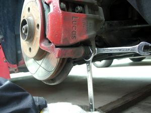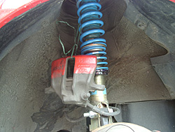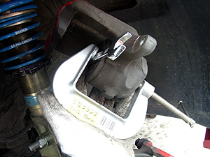 キャリパーは、ブレーキホースに負担をかけぬよう、針金等でサスにつり下げておきます。