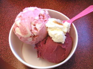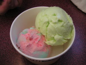 私の定番グレープソルべと、いちごみるくをダブルで、相方は今月のフレーバーのメリーミントと、マスクメロンをダブルで、おやつタイム。(2004/12)