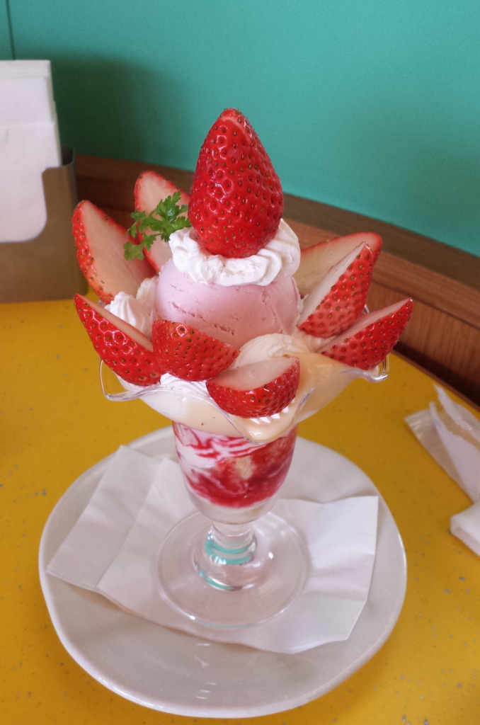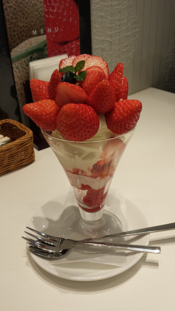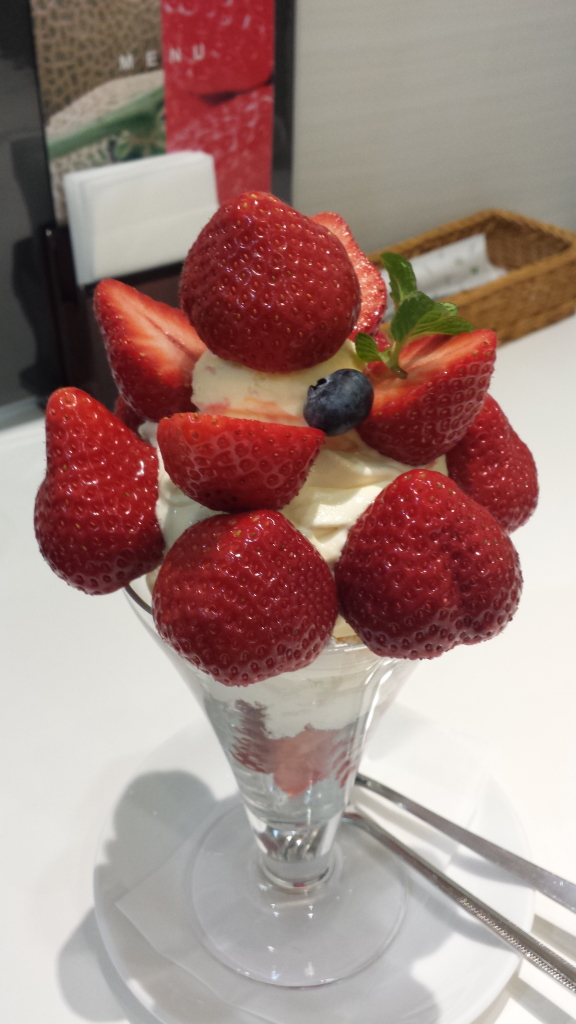 あまおう苺パフェ1800円。おおきくて濃厚な甘酸っぱさのあまおうがたっぷり入って、めっちゃおいしかったです。