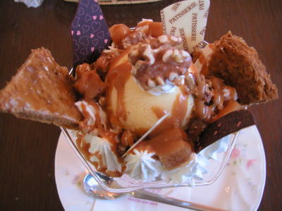天気がいいので喫茶コーナーに行ってきました。抹茶ムースとアイスコーヒーのセット、ムースとゼリーが抹茶で、あずきと甘栗のコンビネーションがイイ。おNEWメニューのクルミとキャラメルのパフェ700円をいただく、こちらはクルミたっぷりでキャラメルソースがかかって、ちょっと大人の味わい、これはおいしい!生クリームが上品で少しバタークリームみたいな感じ。パティシエのおじさんが作ってくれるよ。今度は定番のフルーツパフェを食べに来ようっと。(2004/06)