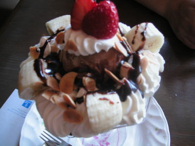 山川の大泉店に、冷たいデザートを食べに行く。白玉ぜんざい300円は、自家製でゆでたような小豆にアイスクリームと白玉が載って甘くておいしい。一年ぶりのかき氷は、抹茶ミルク350円、暑いところで食べると涼しくなるねぇ〜。(2004/07)