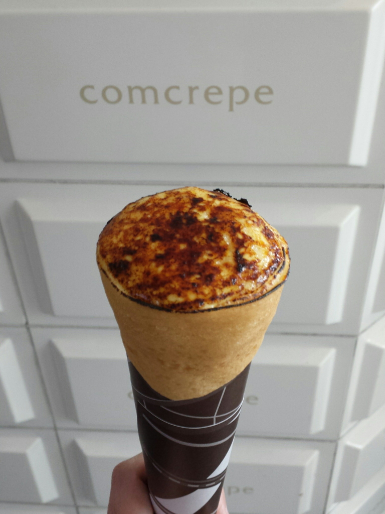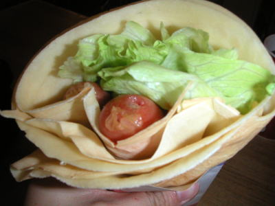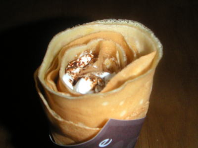 以前から行ってみたかったクレープ店へ、駅構内のちょっとさびれたショッピングセンター内にあるが、ここはそれなりに次から次とお客さんが来る。バナナチョコ・クレープ280円とフランク・クレープ380円を注文、おばちゃんは凄い手際の良さでクレープを焼いて具を包む。軽く食べられそうと思ったら結構量があり、お腹いっぱいになりました、なんといっても安い!(初・2004/04)