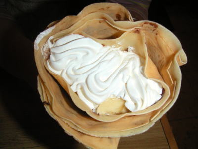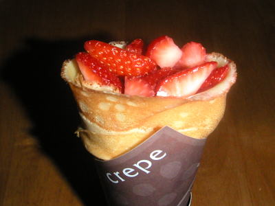 今日は「PM1時から開店」の張り紙があり、その頃入店。するとその後、次から次とお客が。メニューはとても豊富、しかし今の時期メロンは無いそうです。生クリームバナナコーヒーを注文、350円。もちもちの皮とボリュームたっぷりのバナナと生クリームに、コーヒーのソースがかかってナカナカGood。最近クレープに凝っている私。(初・2003/02)
