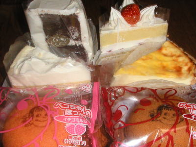夜行っても店内には10人ほどのお客がいるし、後からもどんどん入店してくる。おっ、夜にもかかわらずショーケースにはケーキがいっぱいある、どうりで、後ろでパティシエがどんどん作ってる、だから品切れもあまり無いんだね。三角ショートケーキ,なめらかチーズケーキ,レアチーズケーキ,チョコレートシフォンとペコちゃんのほっぺを購入、どれも安い。三角ショートケーキは、スポンジがいかにも大手メーカーらしい感じだが、フワフワで味はなかなか、クリームもおいしい。なめらかチーズケーキは、ふわふわで新食感、味も他にはない感じでおいしい。レアチーズはあまりこってりしてなくマイルドで食べやすい。チョコレートシフォンはあっさり味。ペコちゃんのほっぺは、すごくふわふわのカステラに、軽いクリームが入ってる、これもおいしい。どれもわりとあっさり目で、何個でもペロッと食べちゃいそうなのが心配かな、安いわりには結構おいしいよ。お菓子やアイスクリームも売ってる、何年後かにはカフェも併設して欲しいな。(初・2004/01)