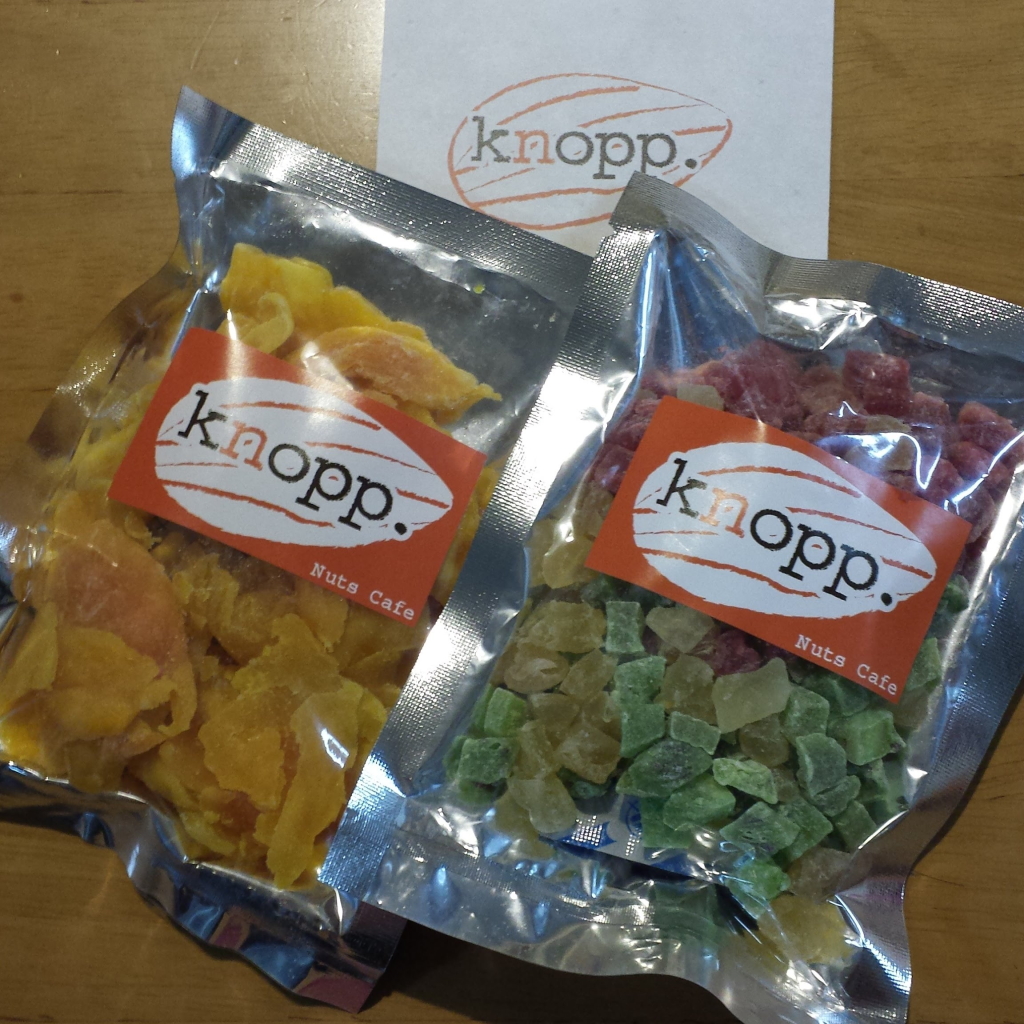 ナッツ&ドライフルーツ専門店クノップ総曲輪店。ドライフルーツのマンゴーと、苺、桃、キウイフルーツのミックス。 毎日、ちょっとづつ、つまんでます。(初・2017/12)