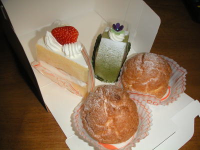ショートケーキ,抹茶ムース,シュークリーム。カステラが昔懐かしい味で黄身がたっぷり、って感じでおいしい。抹茶ムースもほどよい甘さでふんわりおいしい。シュークリーム120円は、クリームがくせのない味で、甘すぎずなかなかよい。値段も良心的、今度はロールケーキ1本を買うぞ!(オーっ!)。(初・2003/06)