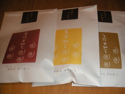 ひがし茶屋街は行ったことあるが、西茶屋街は初でこちらもなかなか雰囲気のある街並み。こじんまりとした店内だが、お客が次々と入ってくる、お上品な店員さんがお出迎え。いろいろな種類の豆を使った甘納豆がたくさん、金時甘納豆280円,白花甘納豆280円,栗甘納豆500円を購入、お茶のお供にしようっと。(初・2004/02)