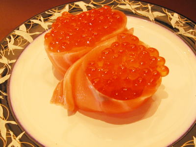 お得なメニュー「あいか皿」はあじ、いわし、かわはぎが1カンずつ、う〜ん私の好きなネタばかりでおいしい!「えび皿」はぼたん海老、甘海老、シロエビが1カンずつ、こちらも私好みで、満足ぢゃぁ〜。(2004/06)