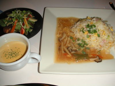 あっさりラーメンが食べたくて、また行ってきました。チャーシューメン700円、手打ち麺にあっさり醤油スープが、とってもおいしい。チャーシューは6,7枚入っているが、しつこくなくて食べやすい。あんかけうどん550円、醤油ダシのあんかけに、細かなきつねとカマボコがはいっている。すりおろし生姜が食欲をそそる。(2003/03)