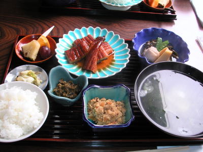 久しぶりに入店、うなぎは富山でここが一番おいしいと思う。カウンター(ほぼ満員)に案内され、お茶と付け出しをもらう。上うな重1,680円を注文、お吸い物と冷奴と漬物付き、良心的な値段である。臭みがなく柔らかなうなぎの蒲焼がとろけるような味わい。今まであまりうなぎが食べられなかった人も、ここのうなぎなら食べられる、と評判。うなぎだけでなく、サイドメニューも豊富なので、一杯飲みながらいろいろ注文するのもよい。持ち帰りもできる。(2003/03)