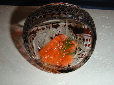 まず付出しでちょっとオッと思わせる、サーモンと玉ねぎのマリネかな、おいしい。