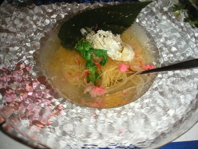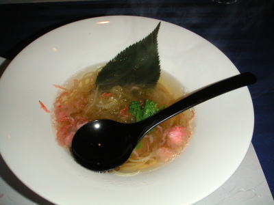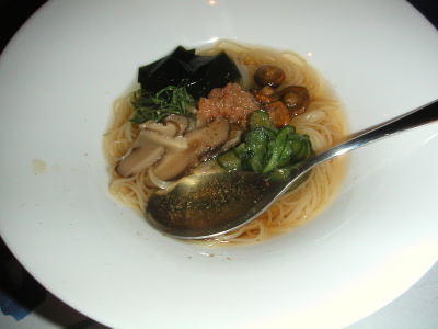 引き続き出てきたのは、冷製パスタのそうめん仕立て。梅肉のさっぱりさと和風だしの旨みがたまらない。