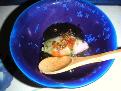 鶏八町味噌150円や、たらこ,おかかなどを購入、他にもメニューは豊富。1個がちょっと大きめでボリュームがある(天むすは小さいが、別途大きいのも売っている)。ちなみに隣に併設して、セルフの讃岐うどんのお店が出来ていた!かけうどん(小)が一杯150円、今回は未食だが今度食べに行きたい。(初・2003/05)