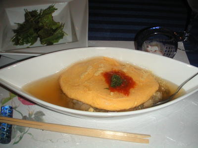 牛ロースしょうが焼定食1,380円、牛の生姜焼きってどんなのかと思ったら、ほとんどステーキじゃん、ミディアムの焼き加減で、もちろんお味はベリーグッド、ご飯がすすむねぇ〜、付け出しも味付けがおいしい。一汁三菜定食1,200円、今日はうどん小鍋と胡麻豆腐のあんかけ、鶏とクラゲの中華風和え物、こちらもダシの味付けがイイ、鍋用に生卵がついてきたが、逆に無いほうがあっさりしておいしいかも。食後にコーヒー付き。久しぶりに入店したが、やっぱりおいしゅうございました。隣に結構広い駐車場があるので車で来ても安心。女将さんがなかなか感じがよい。(2004/01)
