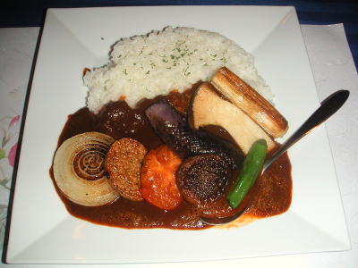 パスタもいいなぁと思ったのだが、今日はハヤシライス1,500円(前菜,サラダ,味噌汁,コーヒー,デザート付き)にしました。出てきたのを見て、これはすばらしい!大きな焼き野菜がたっぷり、その下にはなんとステーキが隠れている。ハヤシのソースは濃厚で深みのある味わい。ステーキもミディアムに焼かれていて、こりゃーうまいわ。ご飯もわりと多めなのでお腹も満足。