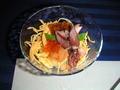 そして、ワイングラスみたいなのに入ったちらし寿司、ホタルイカも載ってこれはおいしい、少しだがご飯も食べられるのがイイね。
