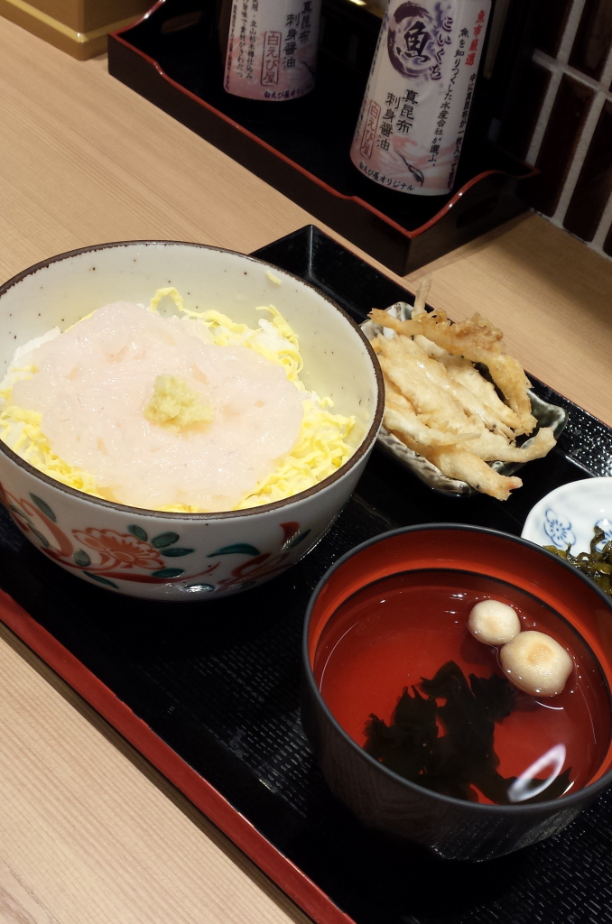 お店の看板メニューは「白えび天丼」ですが、今日の気分はちょっと奮発して「白えび刺身丼(1,980円)」を食べてきました。甘くてねっとり感の身がたっぷりの白えびがたまりませんな〜。白えびの天ぷらもカリカリとおいしいよ。