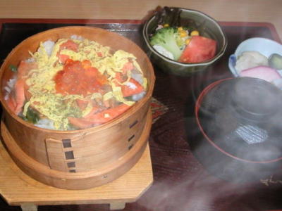 てんてん定食800円,鮭親子わっぱ780円。定食はお刺身つきで品数多く、どれもおいしい。わっぱはアツアツでシャケとイクラと山菜、味のハーモニー。食後のデザートにコーヒーかアイスクリームも付く。この値段はお得、お座敷席も多く、BGMが流れ雰囲気もよい。住宅街の中であまり目立たないが、お昼は結構人が入っていた。大満足!また行こうっと。(初・2002/12)