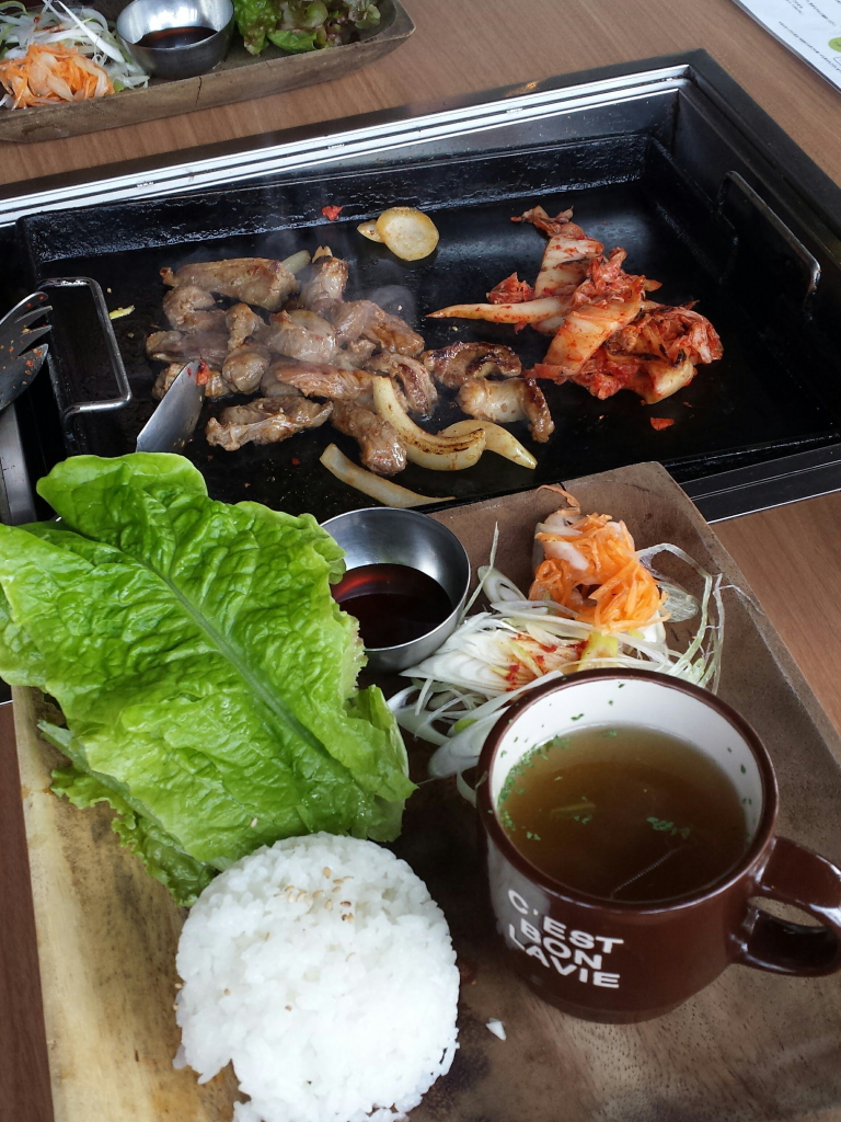 サムギョプサル目あてで行ったものの(豚の脂はキツいかな?と気にしつつ入店したら)、メニューにカルメギサル定食(豚ハラミ食べ放題)があり、これにしました。