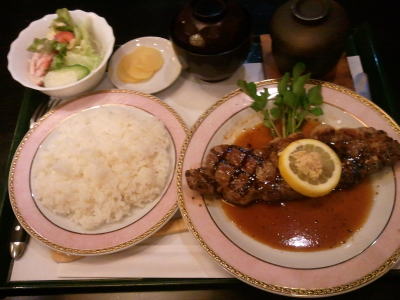 サーロイン・ステーキとライスを注文。出てきたステーキにソースをかけてもらい目の前に出される。さっそくいただきま〜す!う〜ん、やっぱりウマイ。ライスはおかわり自由。サラダバー,スープバー,ドリンクバーのセットなどもあるので、ボーナス出たらステーキ2〜3枚と、セットで目一杯食べてみたいものだ。(初・2008/11)