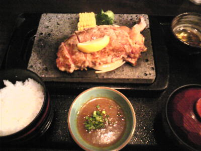 石の上で、お好みの具合に焼いて、さっそくいただきます!うん、お肉が柔らかくておいしいっス!、ガーリックオイルをタレに加えて食べるとこれまたおいしい。他にうどんもついたセットメニューやお子様メニューもあるよ。(初・2009/8)