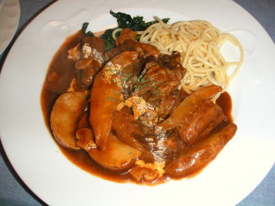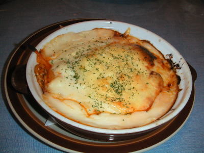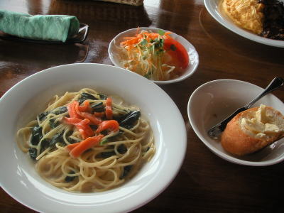 ポークピカタピラフは、ピラフだけでもおいしいのに、その上にポークピカタがのって、デミグラスソースがかかっている。海の幸スパゲティグラタンは、貝柱,イカ,エビがたっぷり、ホワイトソースがgood。どちらも、味噌汁とサラダ付き。値段はちょっと忘れたが、若干高め1,200円くらいだったかな?。ランチは780円とのこと。(初・2002/11)