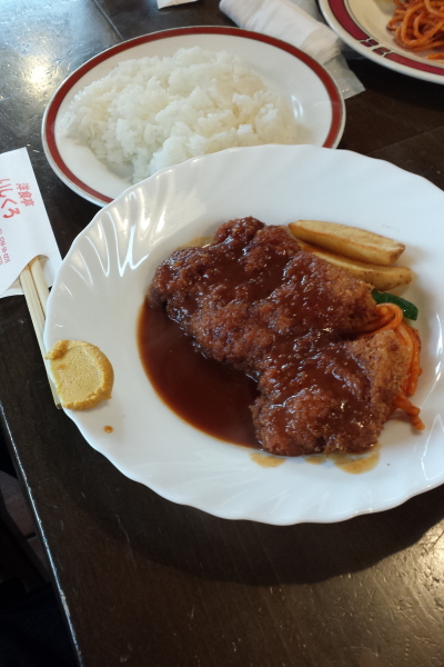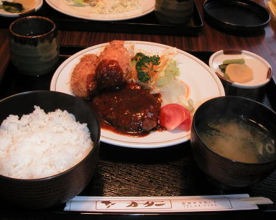 ハンバーグ定食,カツカレーを食べる。値段は若干高めのような気もするが、本格的な洋食を家庭的な雰囲気の中で味わえ、ボリュームも満点。柳沢選手の写真とサイン色紙があった。他のメニューでは豚の唐揚げが有名。お店の立地条件があまり良くないのに、結構頑張っているお店。(2002/10)