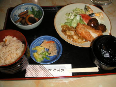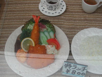 店内はカウンターのみ8席ほどでこじんまりしている。特ランチ800円、エビ,白身魚,カツのフライ3種とハンバーグにサラダ、もちろんライス,味噌汁,ドリンク付き、味もなかなか良くおいしかった。オムライス500円、ご飯に濃い目の味付け、こちらもおいしい。今度はビーフシチューやカレーも食べに来ようっと。+50円で持ち帰りもできる、営業時間11:00〜20:00まで。参考:微妙に違うが、これが特ランチ。(初・2004/01)