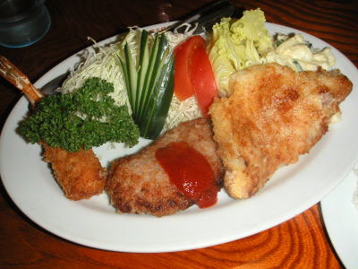 魚フライ,エビフライ,とりのから揚げ,ハンバーグの4大おかずに、スパゲティとサラダと味噌汁と漬物がついて、こりゃーもうたまりません。ごはんは改めて見ると「どんぶりめし」くらいの量がありお腹いっぱい。厨房にはシェフのおじさんと、もう一人シェフの格好をした体格のいいお兄さんがいました。(2005/07)