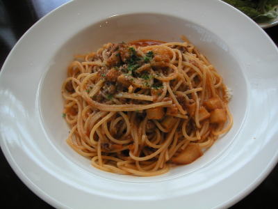 お昼時を過ぎているのに店内は満員。ジャーマン・トマト・スパゲティ850円、ソーセージが入ったトマトソースのパスタ、さわやかな酸味とシャウエッセンみたいなソーセージがうまい、量の多さに改めてびっくり。相方はハヤシオムライス(少なめ)、こちらもうまい。おじさんが1人で忙しそうに調理していた。(2005/01)