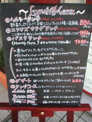 料理の盛り付けにもセンスの良さが感じられる、男性には量はさほど多くない印象だが女性にはちょうどよいかも、とにかく味はおいしい。夜は10時まで営業しているみたい、ソフトドリンク無料券をもらっちゃったので、今度は夜のメニューを食べに行こうかな。(初・2005/01)