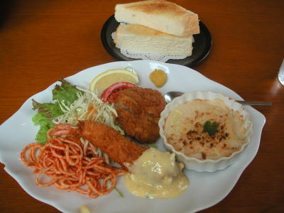 やっと行くことができました、洋食の名店。エビフライとカニコロッケの定食1,200円、カニクリームとハンバーグの定食1,200円。カニの身がこれでもか!とたっぷり入り、マイルドなホワイトクリームとからまって、たまらなくおいしい。エビフライも、大きめぷりぷりのエビが、からっと揚がっておいしい。ハンバーグは硬めで、食べ応えあり。ご飯もおいしく量は多め、いい材料を手間隙かけて調理しているので、この値段は決して損ではない。店内は思ったより広く、テーブルの配置にも気を配ってあるようで、雰囲気もよい。高岡に行ったら、また寄りたい。(初・2003/06)