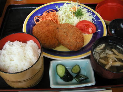 今日のランチから、メンチカツ定食880円、メンチカツがもろハンバーグ(?)って感じでボリュームがある。お味はとってもおいしい。