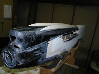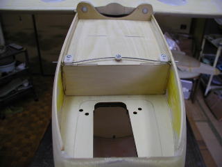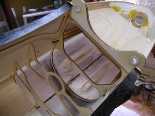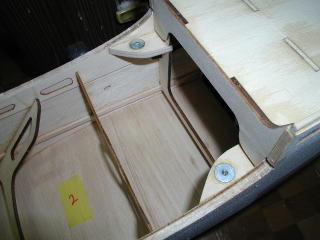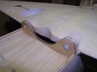 完全低翼なのでダウエル受けを6mmベニヤで強度を確保。マフラの逃げを10mm彫り込みます。 | ベリーパンは直線で受けますので合わせがとても簡単。 エンジンヘッドがベリーパンから出る様に大きく穴が空いている為スッパーの取り付けも簡単に出来ます。 |