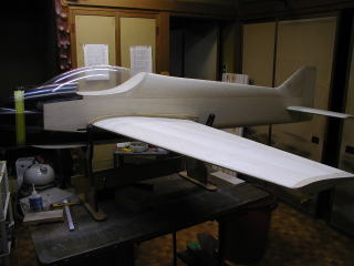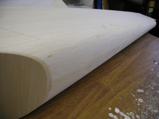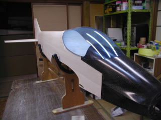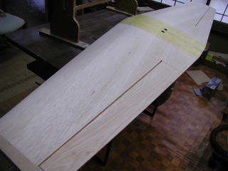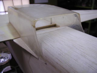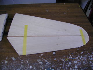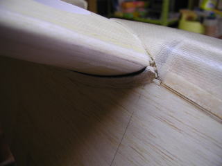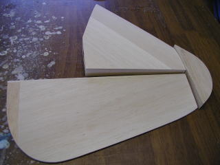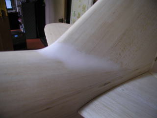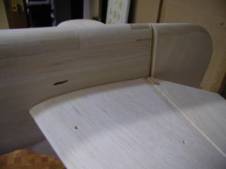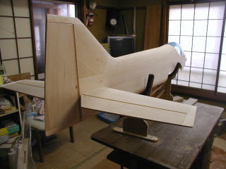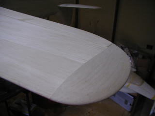 | 翼端は完全にエッジを立てて整形。2mmバルサプランクを削る位から滑らかにRを形成しなるべく薄く削り翼端抵抗を減らします。この機体の穏やかな飛行特性は丸く薄い翼端形状だからです。 | 水平は2mmビスでカーボンパイプに締め付けます。エレベーターロッドの出口の位置は最初から空けてあります。 | 垂直と胴体とのRは軽量パテで整形。バルサブロックからの削りだしと比べ大幅に短時間で出来また軽量化にも貢献しています。 |