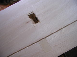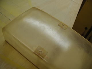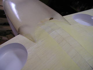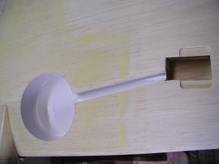 | 下面のグラス補強はタイヤカップが完全に隠れるまで貼ります。段差をパテで面を出しておきます。MK引き込み脚のピアノ線に合わせてのカップ位置です。メカ積みのさいピアノ線を切る手間がありません。 | エルロンホーン受け台はヒンジラインと直角に埋め込みます。 ヒンジはOK模型のイージーヒンジを全舵に使用します。 |