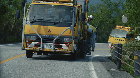 「毎日が勉強」。この仕事を始めて20年以上になる谷口は、今も初心を忘れない。道路上に当たり前にある白線や案内標示。一見地味だが、交通安全には無くてはならないもの。その1つ1つは、道路作業員たちの地道な手仕事と使命感が生む。集中力と忍耐力が求められる裏方の現場。今年一番の大仕事、立山有料道路のライン引き。路面からじわりと滲み出る、谷口のプライドを見た。