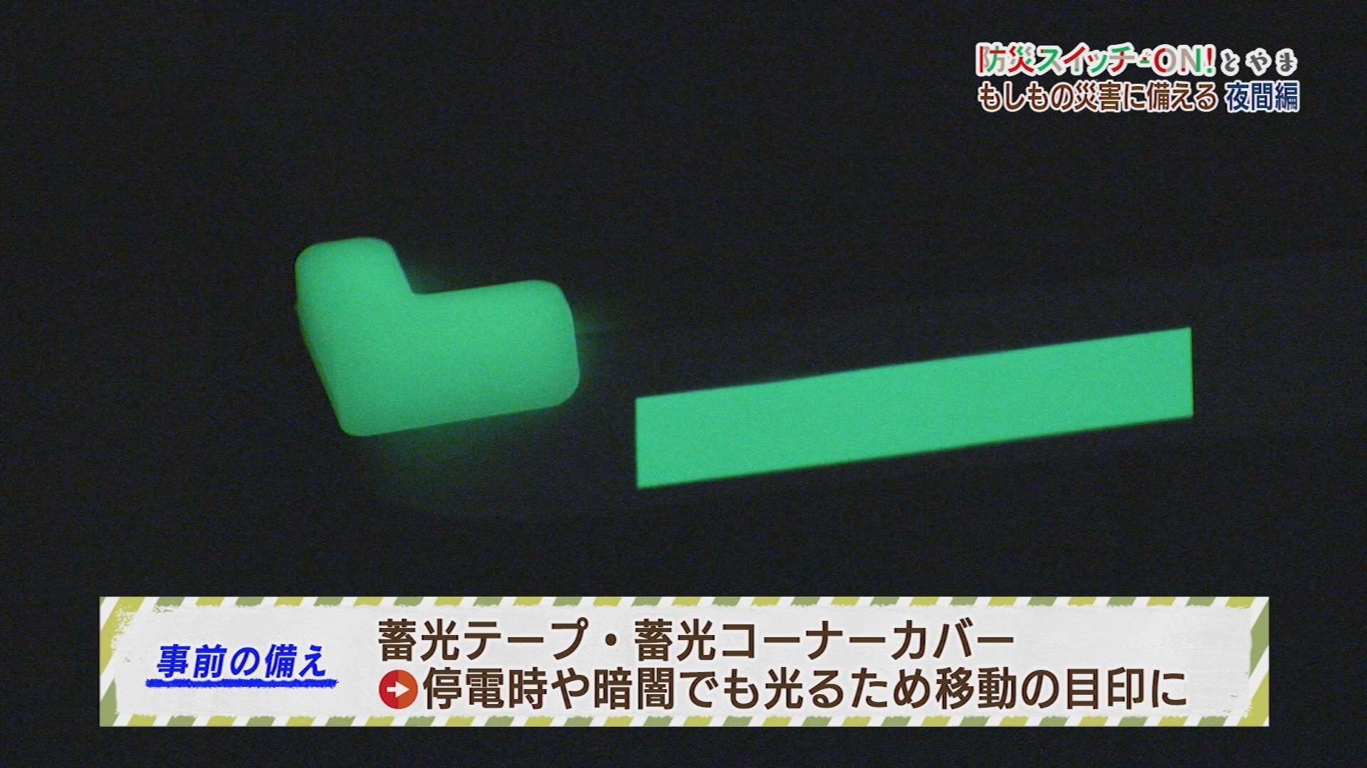 通常の備えのほか、 事前にできる備えとして、廊下や階段、ドアに蓄光テープを貼っておくと、暗闇でも目印になります。 |