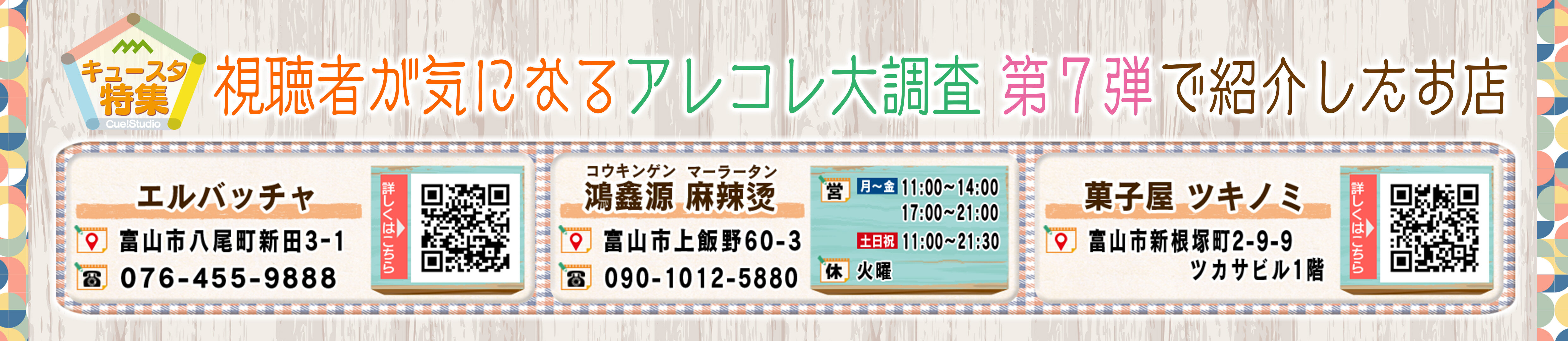 11月1日からの放送は、 ・キュー特「視聴者が気になるアレコレ大調査!第7弾」 ・machiもり「地産地笑マルシェ in 環水公園」 ・toieba information「おうちまるっとウォッチング」 |