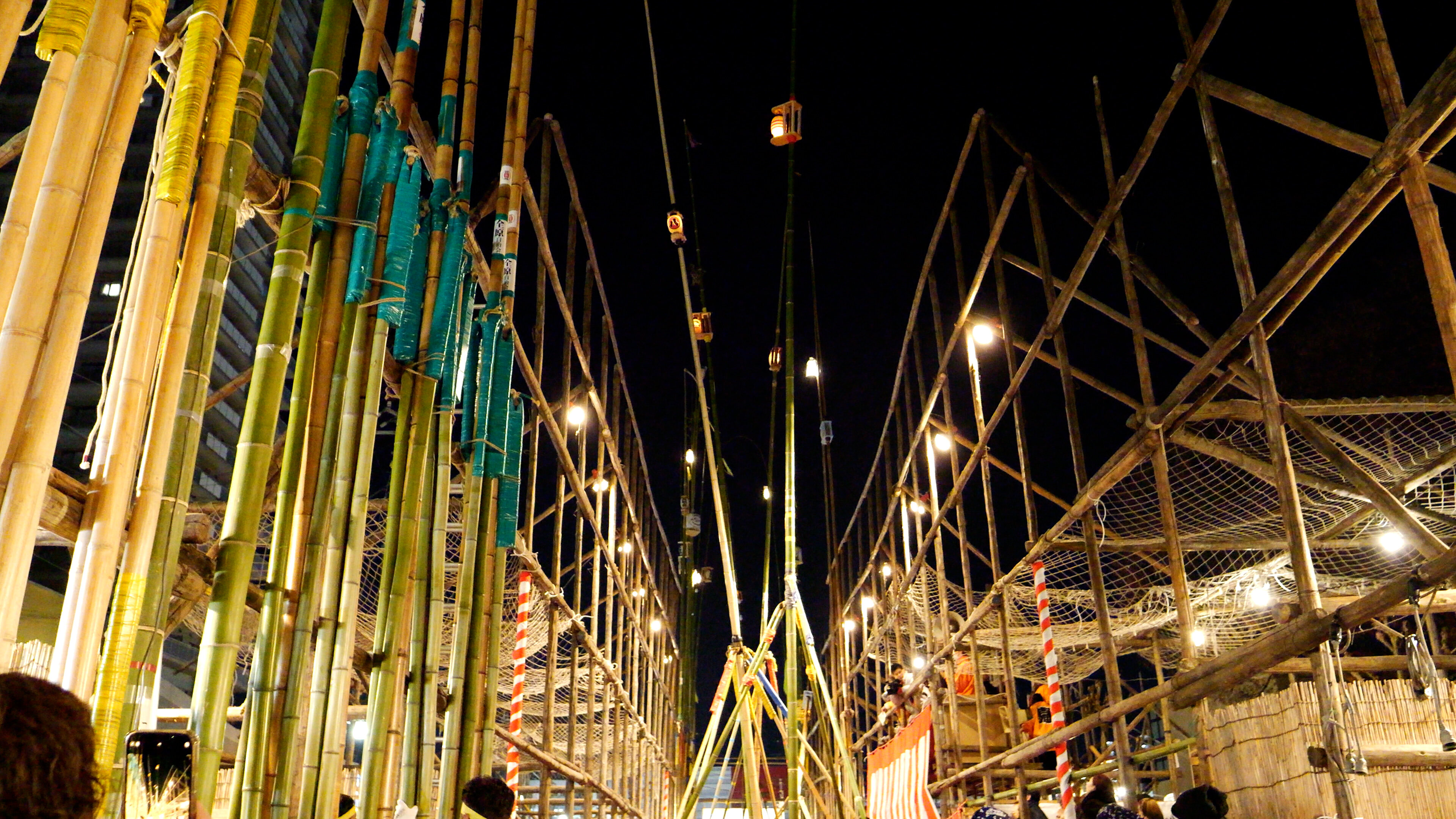 市内各団体が、20メートル近い竹竿の先につけた提灯を