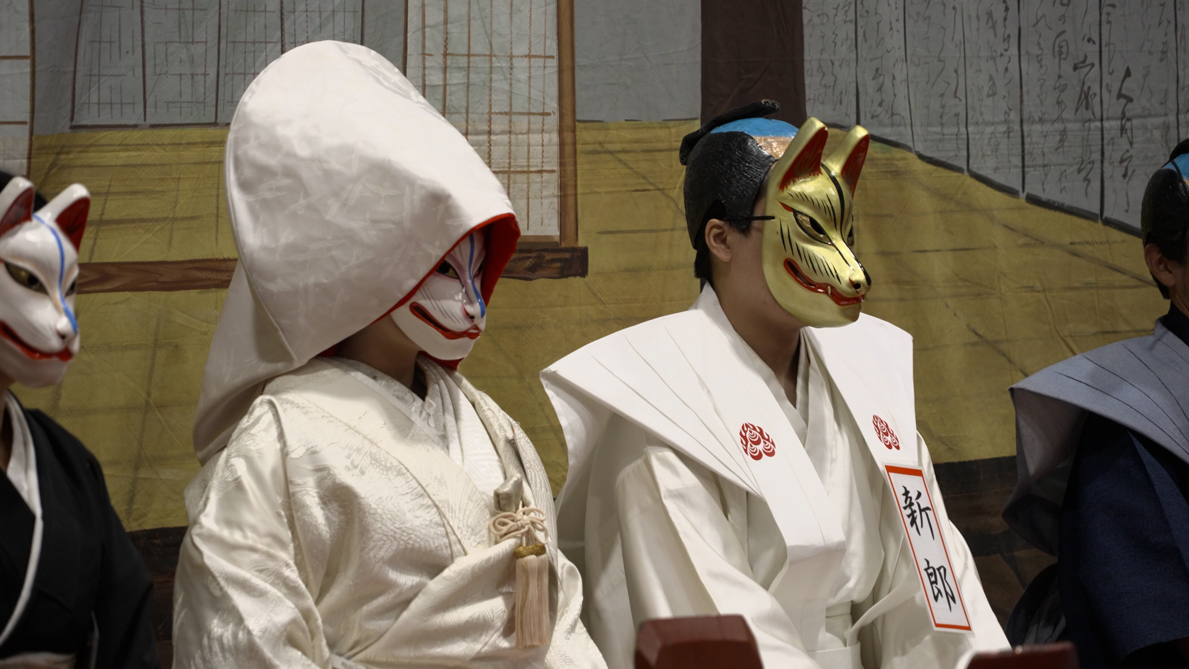 狐の面を被った夫婦が人力車で街を練り歩きます。