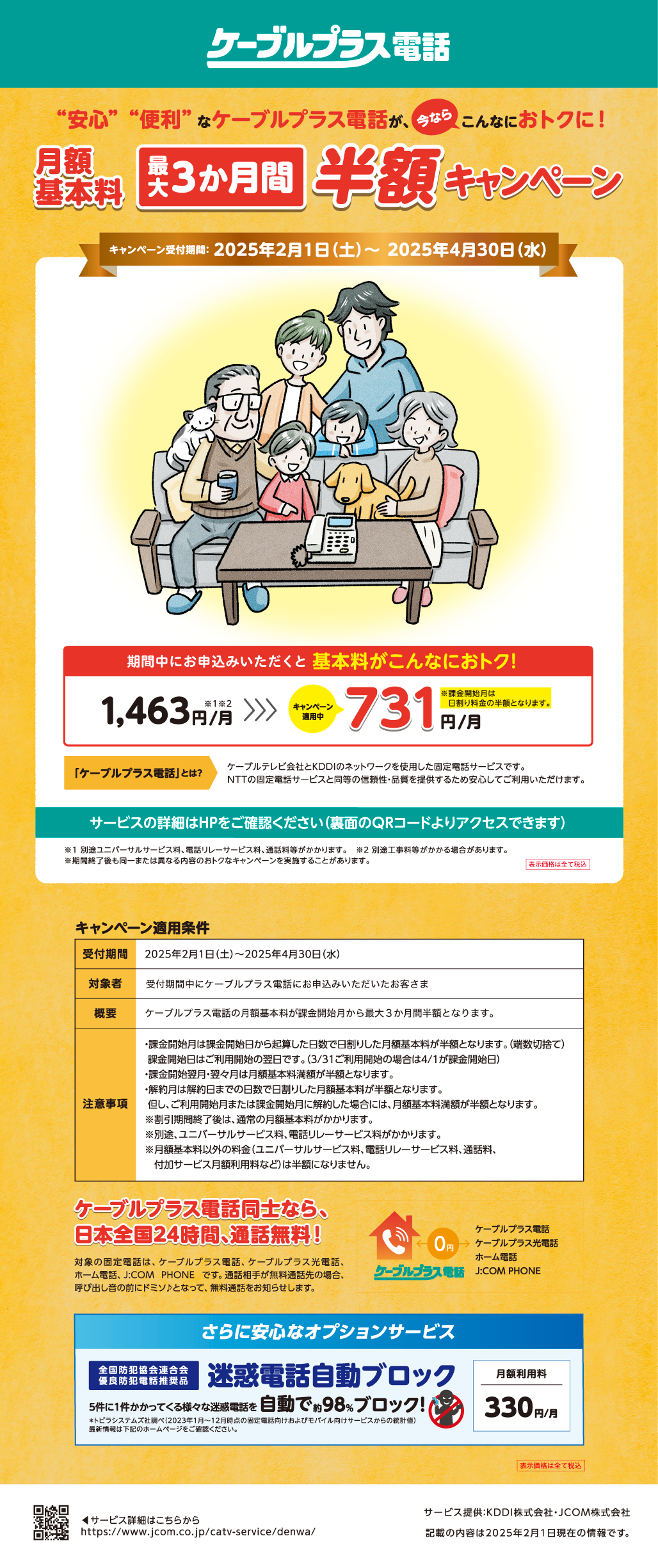 お知らせキャンペーン情報光デンワ ケーブルプラス電話最大3か月間半額キャンペーン 2025年1月31日 サービス詳細はこちらから↓ https://www.jcom.co.jp/catv-service/denwa/ カテゴリ お知らせ キャンペーン情報 光デンワ お知らせTOP